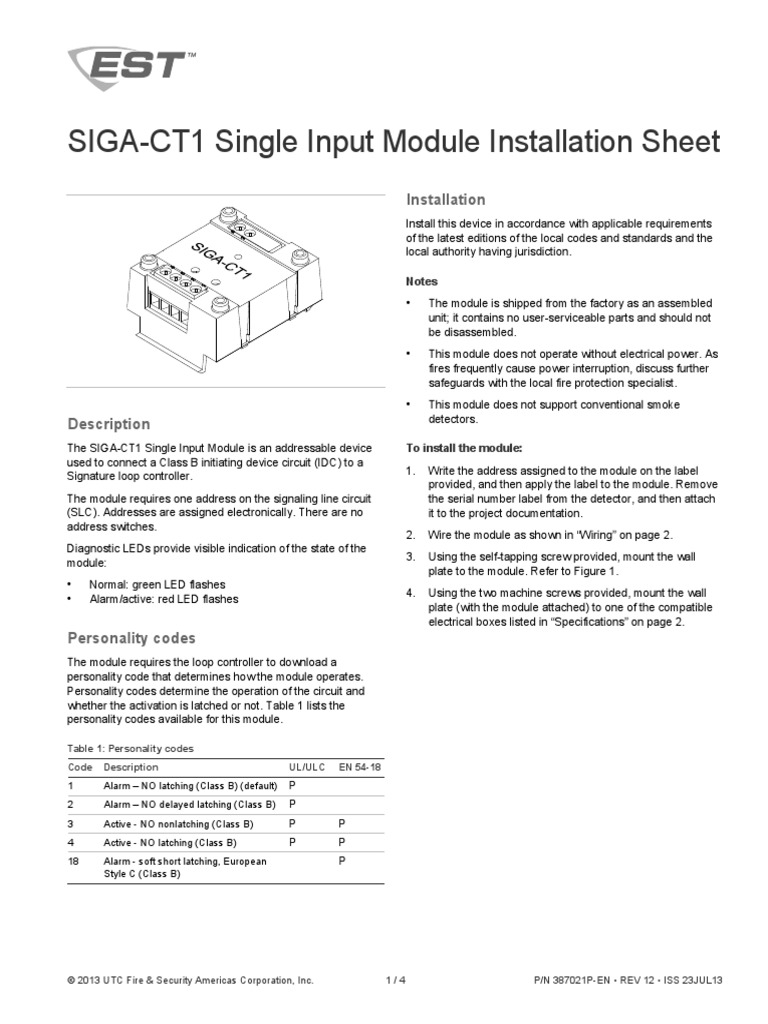 Siga Ct1 Single Input Module Installation Sheet Pdf Amplifier Electrical Wiring